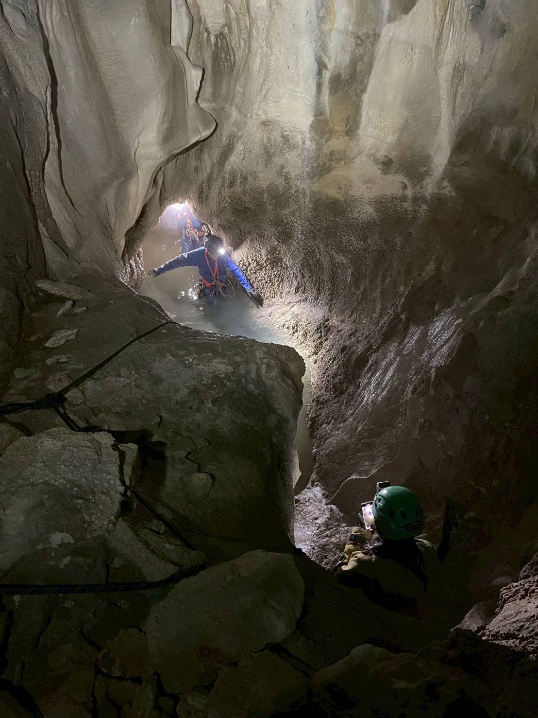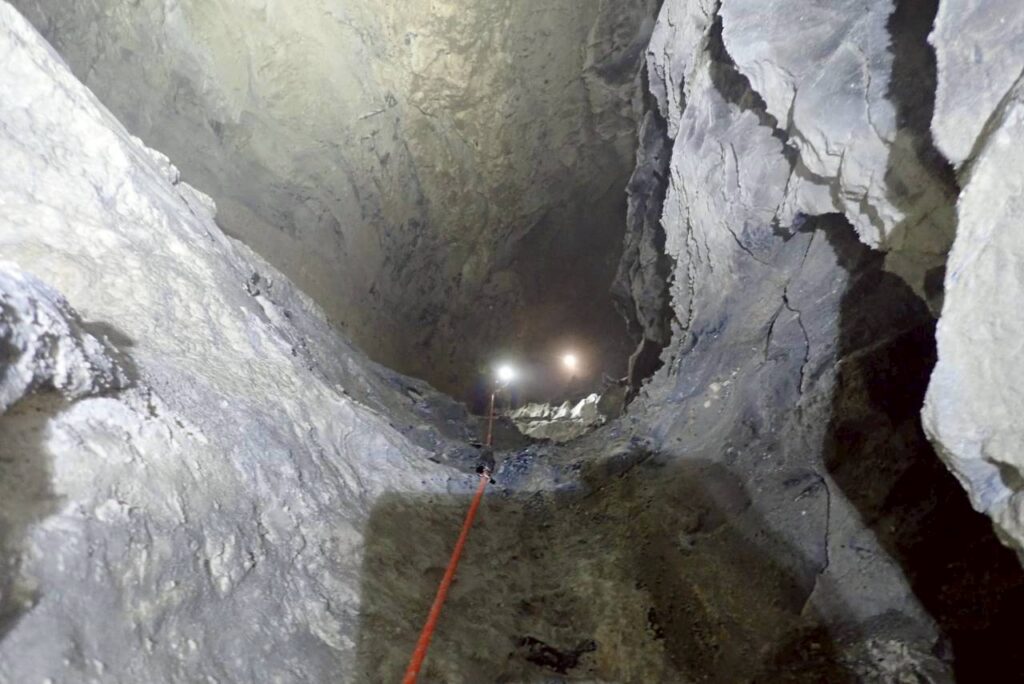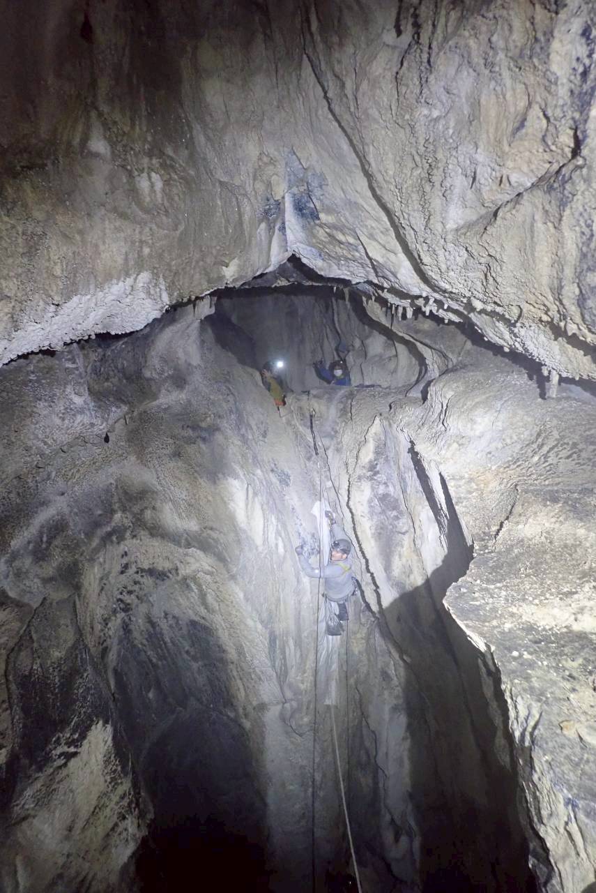 臼倉、星宮、チャールズさん、エリーザさんはFホールをSRTで往復し、メインシャフトへのルートを確認した。この場所は壁付きのロープ登降で、プロテクターをつけていてもロープが擦れる箇所が目立っていた。再び利用するにはルート整備が必要だろう。