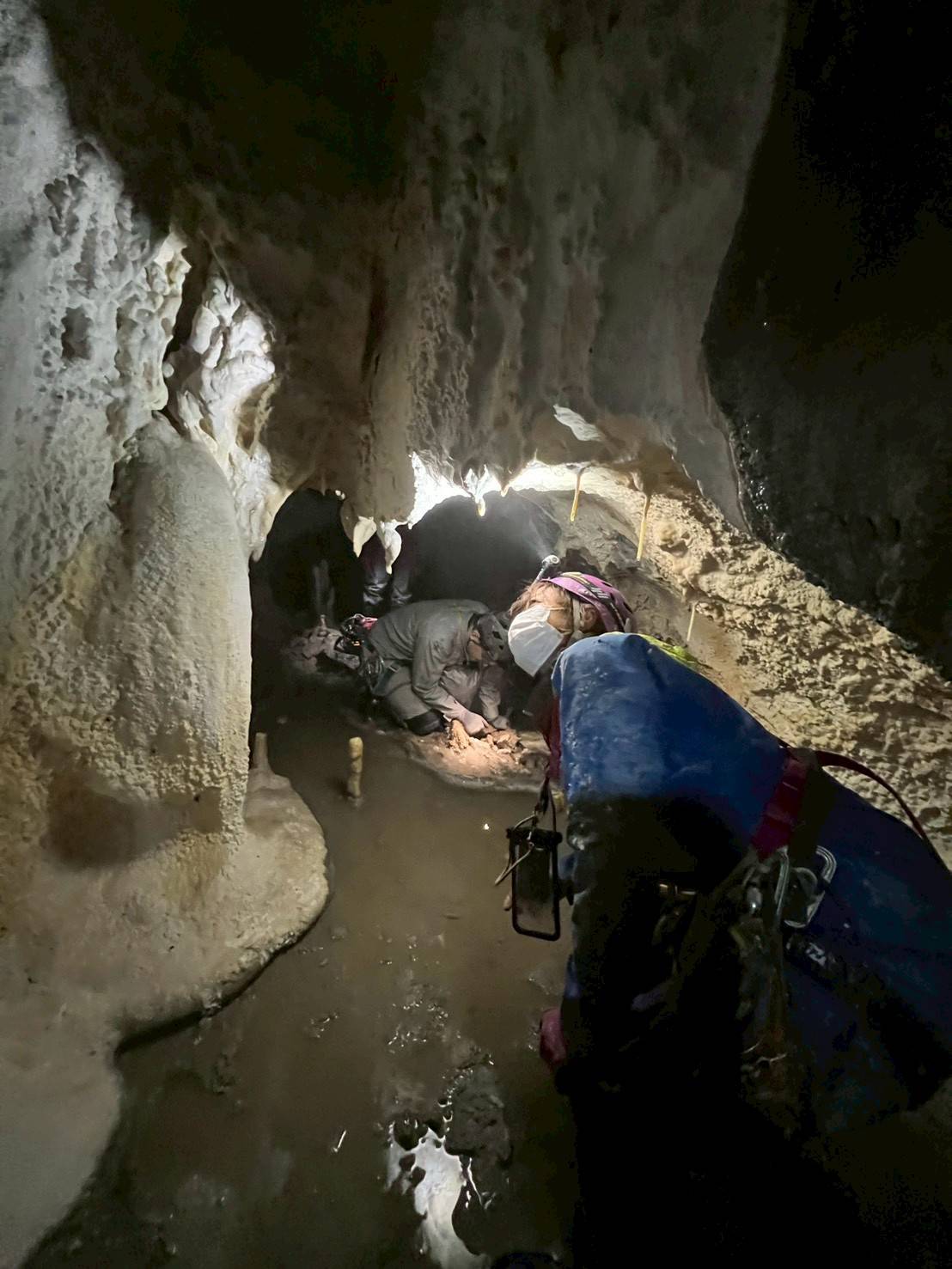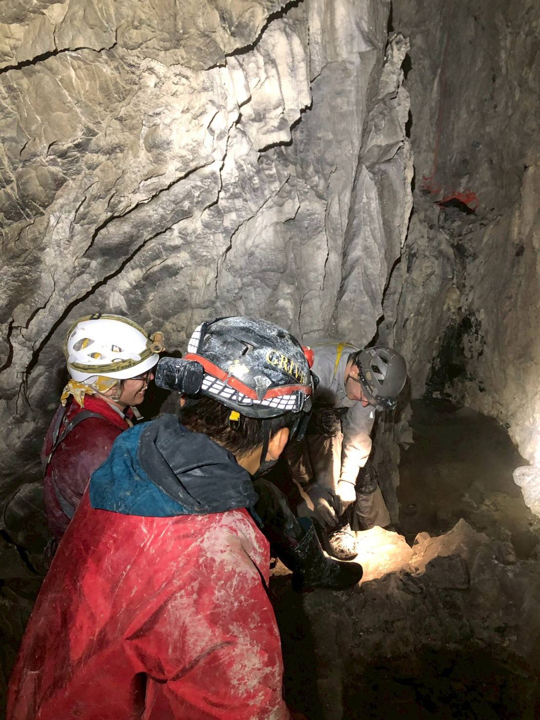 この奥には、上部に以前発見されたが未踏の穴があり、向かうことにする。そこに、ぽっかり空いた小さな穴を確認した。早速、星宮が3mほど登攀し、頭から突っ込むが1度断念。かなり狭いため、SRTハーネスを外して再挑戦した。入口も大変だったが、進んでいくとさらに狭洞となっており、ヘルメットを外して突破した。